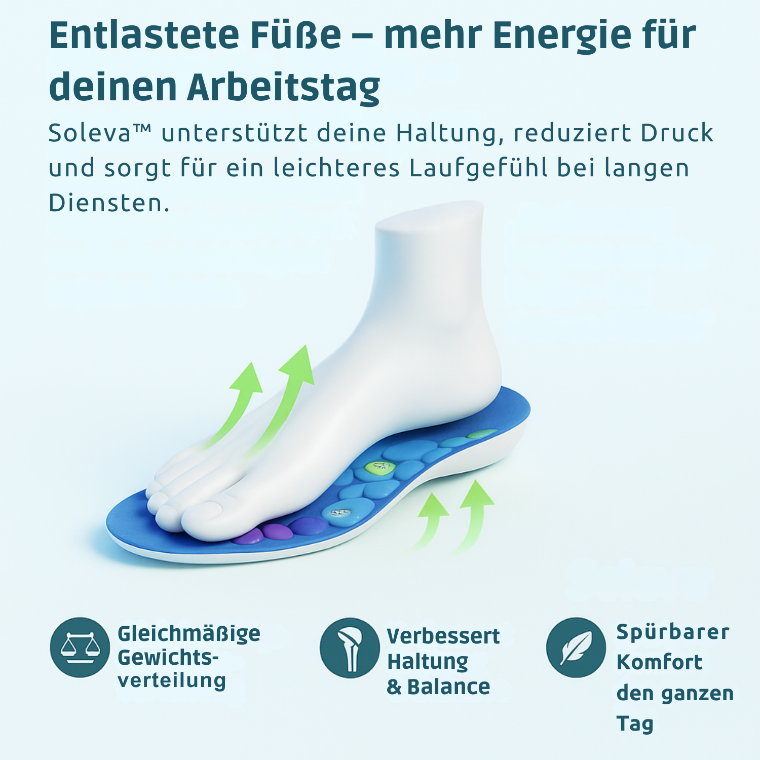 Ob Klinik, Pflege oder Praxisalltag – Soleva™ sorgt dafür, dass sich deine Füße auch nach langen 8–12h-Diensten leichter und entspannter anfühlen.